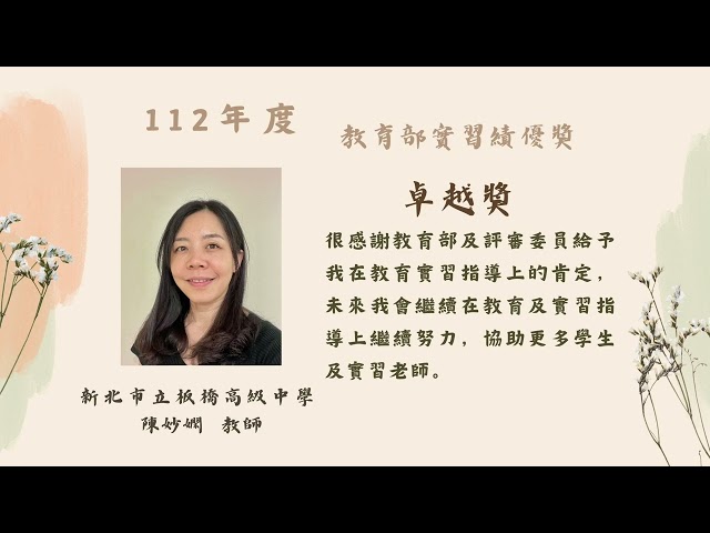 | 卓越獎 | 黃怡嘉 | 國立臺北教育大學 | 彰化縣彰化市大竹國民小學 | 國民小學 |